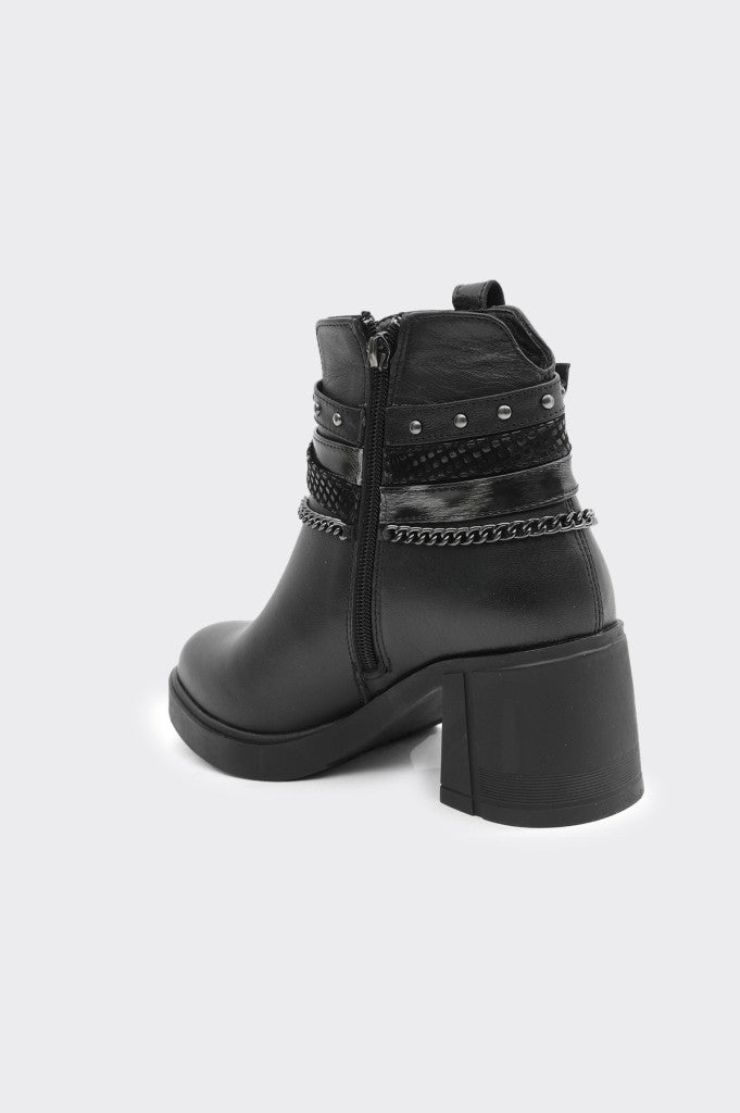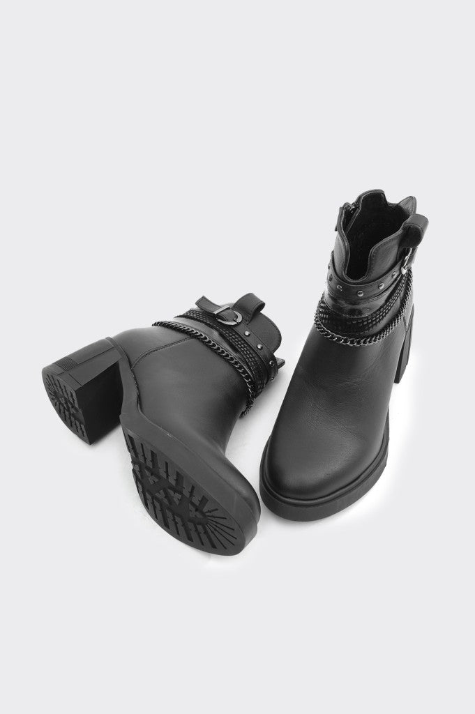 Hakiki Deri Fermuarlı Zincir Aksesuarlı Topuklu Kadın Bot