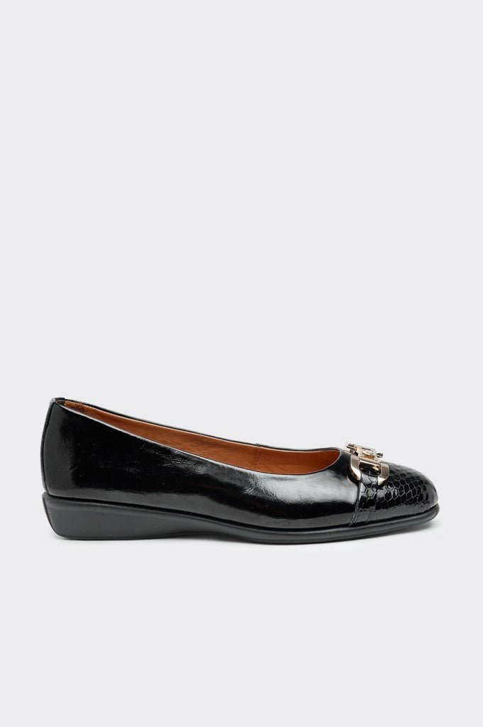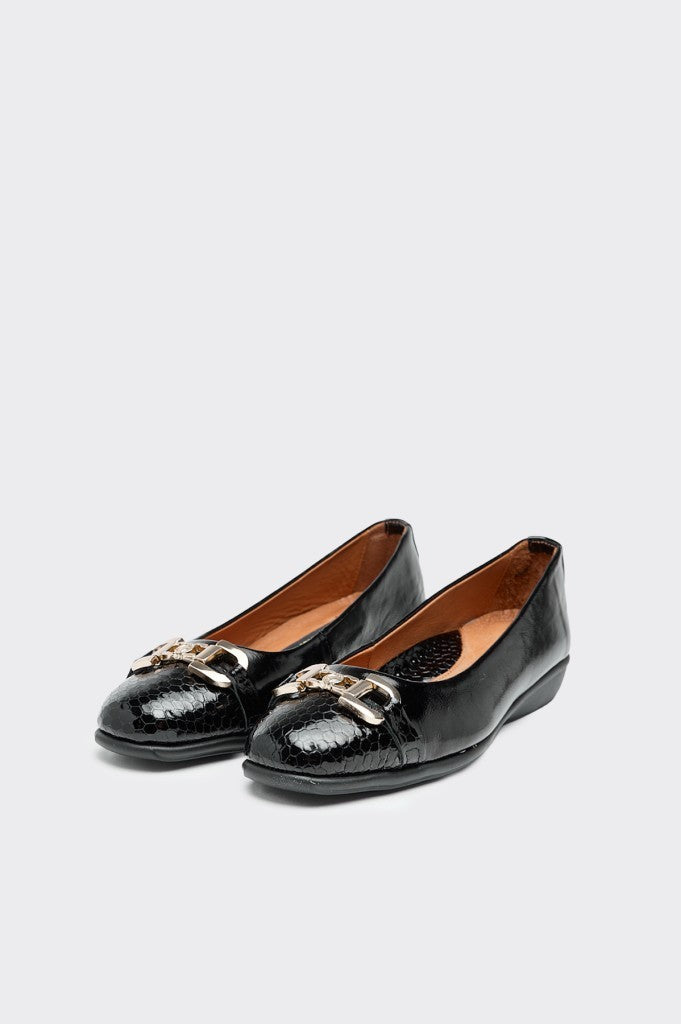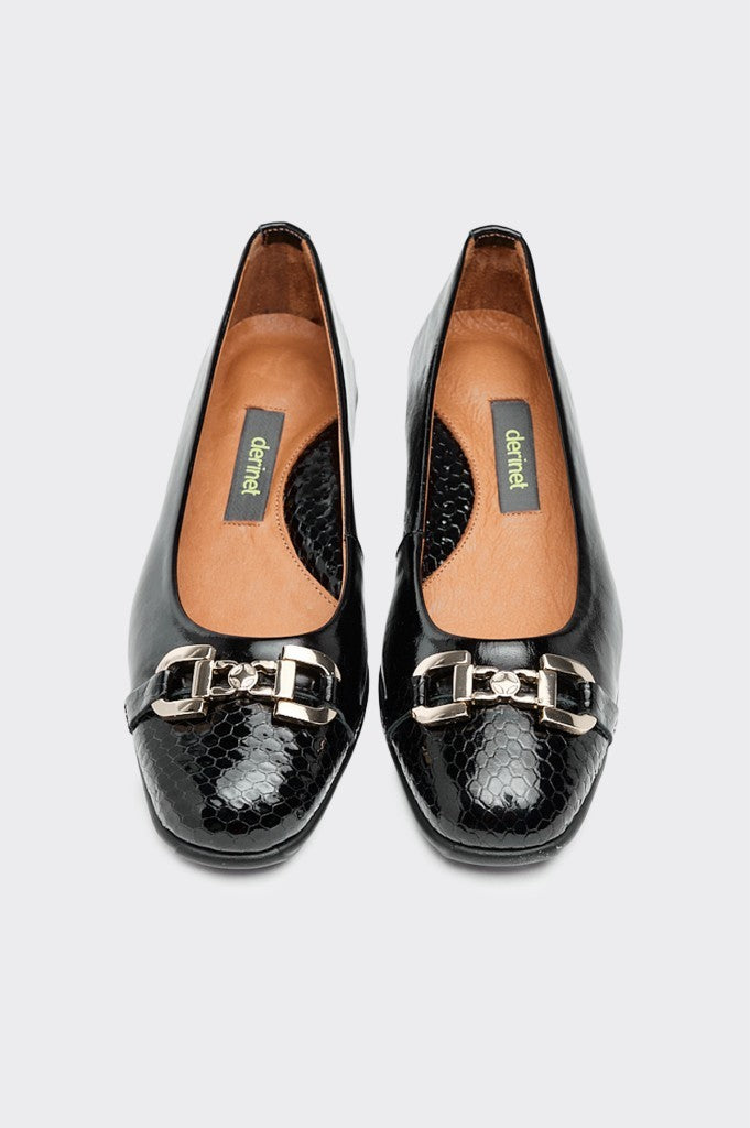 Hakiki deri malzemeden üretilen bu babet, vizon siyah rugan croco rengiyle şıklığınızı tamamlıyor. Üzerindeki tokalı detay sayesinde hem güvenli hem de stil sahibi bir kullanım sunuyor. Kaliteli deri yapısı uzun ömürlü kullanım garantisi verirken, rahatlığı sayesinde gün boyu ayaklarınızı yormuyor. Zarif tasarımı ve özenli işçiliğiyle günlük kombinlerinizin vazgeçilmezi olacak.